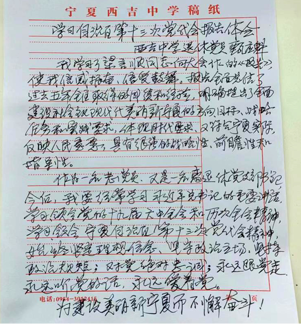 西吉中學(xué)退休黨員甄應(yīng)魁寫到:自己作為一名老黨員、一名離退休黨支部書記,今后要經(jīng)常學(xué)習(xí)習(xí)近平總書記視察寧夏重要講話和指示批示精神,為建設(shè)社會(huì)主義現(xiàn)代化美麗新寧夏而不懈奮斗!