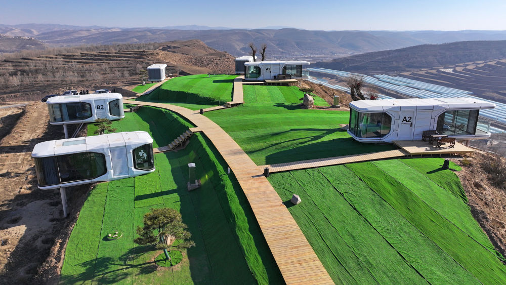 西吉縣新?tīng)I(yíng)鄉(xiāng)甘井村旅游示范點(diǎn)新建成的“太空艙營(yíng)地”(2023年12月1日攝,無(wú)人機(jī)照片)。新華社記者 王鵬 攝